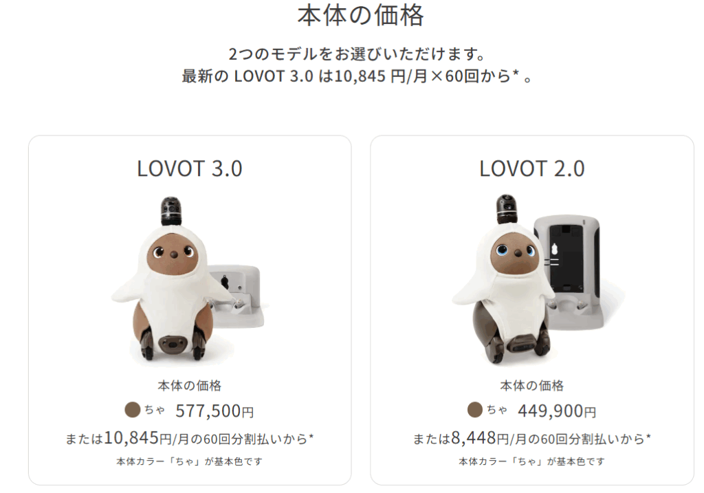 LOVOT | 約500,000円〜(世代や色で変動) | 月額約9,900〜20,000円程度のプラン体系 |