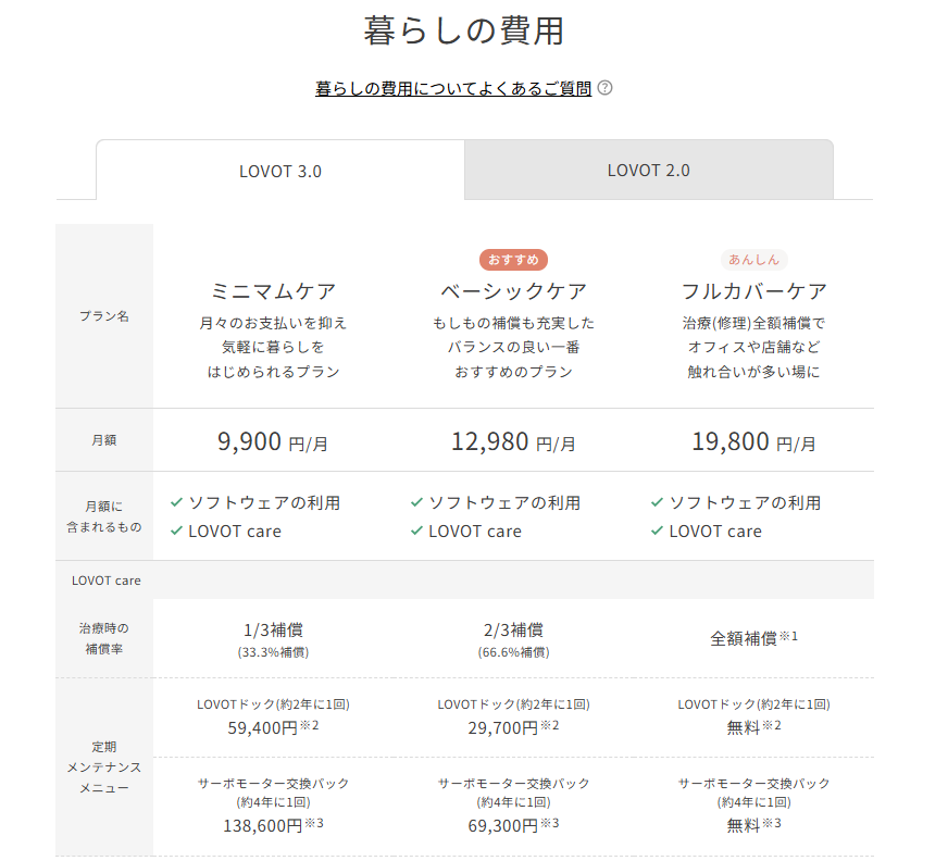 区分 | 月額の目安(LOVOT 3.0) | 月額の目安(2.0/初代) | 主なサポート内容 | 補償範囲の特徴 | おすすめ家庭タイプ |