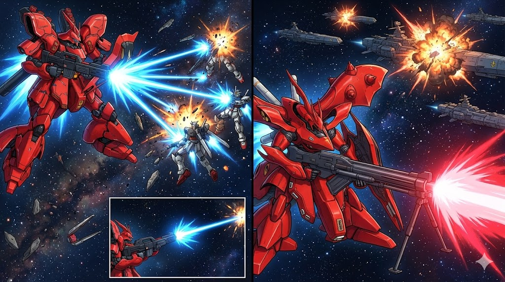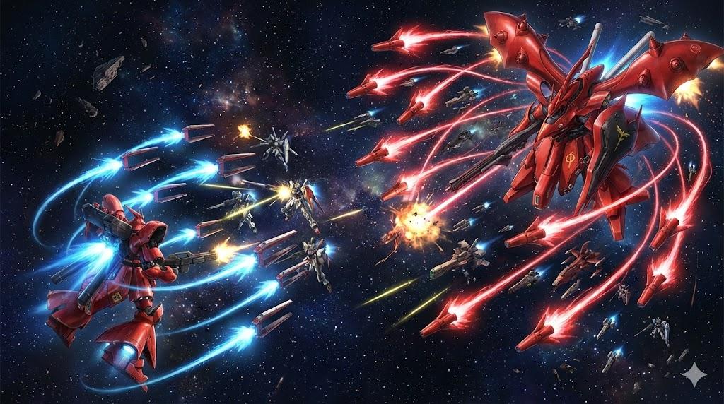 この3機を並べて考えると、サザビー:バランス型の総帥機、ナイチンゲール:火力特化の怪物機、シナンジュ:高機動寄りのエース機という役割分担が見えてきます。つまり、「指揮官として前線で戦いつつ、部隊全体をまとめ上げる」のがサザビー、「敵艦隊を一撃で叩き潰すための切り札」がナイチンゲール、「カリスマ的エースが超機動で戦場を駆け回る象徴」がシナンジュ、といったイメージです。