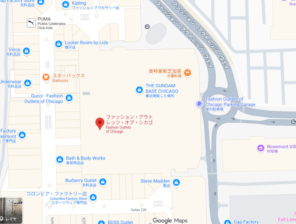THEGUNDAMBASEシカゴは、ローズモントにあるFashion Outlets of Chicagoの中にあります。ここ、初見だと「思ってた場所と違うかも」と感じやすいポイントです。シカゴ市内のど真ん中ではないので、その前提で動くのが大事ですね。